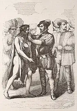 Aguilar and 11-12 other survivors[2] were captured by the local Maya and scheduled to be sacrificed to Maya gods. Valdivia and four others met this fate. Others died of disease and, in the case of the women, overworked as slaves. Aguilar and Gonzalo Guerrero (a sailor from Palos de la Frontera in Spain) managed to escape, later to be taken as slaves by another Maya chief named Xamanzana who was hostile to the first tribe.[3] Here he and Guerrero were able to learn the language of their captors. Aguilar lived as a slave during his eight years with the Maya. His continued fidelity to his religious vows led him to refuse the offers of women made to him by the chief. Guerrero became a war chief for Nachan Kaan, Lord of Chektumal, married a rich Maya woman and fathered the first mestizo children of Mexico.
