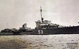 When World War II began in September, she was initially deployed in the German Bight where she laid defensive minefields. The ship then patrolled the Skagerrak to inspect neutral shipping for contraband goods.[6] On the night of 17/18 October, Rear Admiral (Konteradmiral) Günther Lütjens, aboard his flagship Z21 Wilhelm Heidkamp, led Z16 Friedrich Eckoldt, Z17 Diether von Roeder, Z18 Hans Lüdemann, Z19 Hermann Künne, and Z20 Karl Galster as they laid a minefield off the mouth of the River Humber. The British were unaware of the minefield's existence and lost seven ships totaling 25,825 gross register tons (GRT). On the night of 12/13 November Z21 Wilhelm Heidkamp, now the flagship of the Commander of Destroyers (Führer der Zerstörer), Kapitän zur See (Captain) Friedrich Bonte, escorted Z18 Hans Lüdemann, Z19 Hermann Künne, and Z20 Karl Galster as they laid 288 magnetic mines in the Thames estuary. Once again unaware of the minefield's existence, the British lost the destroyer Blanche and thirteen merchant ships displacing 48,728 GRT. On 1 December she began a refit at Stettin that lasted for three months.[7]