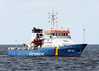 Her mission includes maritime border protection, pollution control, fishery inspection, and coastal patrol within Germany's exclusive economic zone in the North and Baltic seas.[3] Although the vessel is part of the Federal Police, she makes up part of the force under the German Coast Guard, along other vessel from the Water Customs, the Federal Waterways and Shipping Administration, and the Federal Office for Agriculture and Food.[5] In June 2021, the vessel participated in the large-scale exercise ATLAS Seal 2021, where she trained alongside EU police partners against terroristic threats in the North Baltic Sea. In June 2024, she partook in UEFA Euro 2024, a multi-national maritime exercise, supporting Schengen border controls.[6] In November 2024, the vessel was deployed to surveil the Chinese-owned Yi Peng 3, after the freighter was suspected of having sabotaged an undersea cable in the area. She served alongside the Danish frigate HDMS Hvidbjørnen.[7] The vessel is also responsible for providing as a training platform and participating in simulation acts coordinated through the Maritimes Schulungs- und Trainingszentrum.