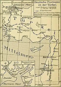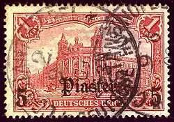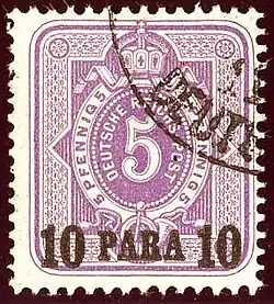 The German post offices abroad were a network of post offices in foreign countries established by Germany to provide mail service where the local services were deemed unsafe or unreliable. They were generally set up in cities with some sort of German commercial interest. In early use only the cancellation mark can identify their postal use abroad; such stamps are known as "Vorläufer" (forerunner) stamps.[1] Later stamps are identified by overprints even when not postally used. German abroad stamps started appearing in the late 19th century and reached their heyday at the beginning of the 20th century; they closed down during or shortly after World War I.