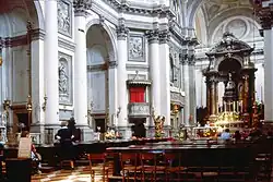 Almost all the sculpture in the church is the work of Giovan Maria Morlaiter, a sculptor from over the Alps, whom Hugh Honour describes as "one of the ablest sculptors in eighteenth century Venice"[21] and Semenzato as "the most brilliant interpreter of the rococo in Venetian sculpture", adding that "His work shows great dynamism" and "an inexhaustible felicity of invention". There is more of his work in the church than anywhere else in Venice.[22]