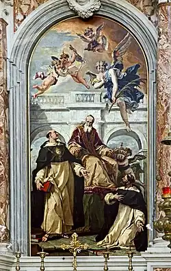 Above the third altar is an oil on canvas depiction of three male Dominican saints, by Giambattista Piazzetta, a topic chosen by the Dominicans to illustrate the missionary activities of their order. Despite the rich Rococo treatment of the subject, Michael Levey writes that the "real triumph of the painting is in its memorably austere tonality."[16]
