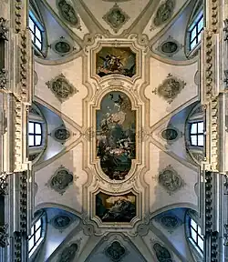 The choir, behind the main altar, has carved wooden stalls dating from between 1740 and 1744 and a ceiling painting by Tiepolo, of David playing the harp.[26]