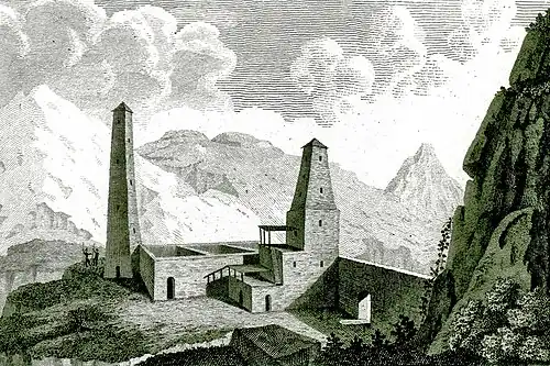 - Ghalghai Koashke (ГIалгIай Коашке)[41] — ancient outposts (stone towers), located in the Terek Gorge, Tarskoye Valley and the Assa Gorge. The outposts in the Assa Gorge of Ingushetia are also known as the Ghalghai Na'arge[42] or Durdzuk Gates.[43]