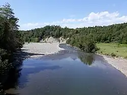 Ghalidzga (Mingrelian: Ghalish Dzga - river bank; Georgian: ღალიძგა, romanized: ghalidzga [ˈɣälid̪͡z̪gä]; Abkhaz: Аалдзга, romanized: Aaldzga) is a river in Ochamchire Municipality, Abkhazia, Georgia.[2] It originates on the southern slope of the Kodori Range, near the Khojali Mountain (elevation 3,313 m).[3] Length - 53 km, basin area - 483 km2. In the upper reaches there is a mountain river with well-defined rapid currents, in the lower reaches it flows into the lowlands and the Black Sea joins south of Ochamchire. It feeds on rain and groundwater. Knows floods in Spring, waterlogging in winter. Characterized by frequent flooding. Average annual flow near the city of Ochamchire - 25.1 mW / s. The main tributaries are the river Gejiri.