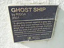 Ghost Ship honors Portland's maritime history and commemorates the ships which wrecked while crossing the Columbia River bar.[2][4] The work has been described as a "sculptural ghost illuminated from within, a beacon from the past marking the river's edge".[4] The Smithsonian Institution categorizes the work as abstract, architectural (ship) and fantasy (ghost).[5] It was funded by the City of Portland Portland Development Commission's Percent for Art program and is part of the City of Portland and Multnomah County Public Art Collection courtesy of the Regional Arts & Culture Council.[2][3]