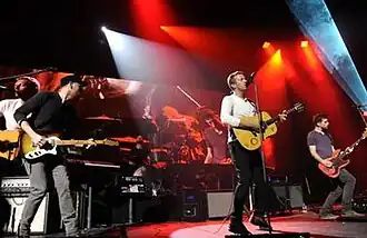 In 2011, Coldplay released their fifth studio album, Mylo Xyloto. Originally conceived by the band as a "stripped-down, more acoustic collection",[2] the album became one of Coldplay's most experimental and pop-oriented records to date; it was described as "luxuriously colourful"[3] where "the choruses are bigger, the textures grander [and] the optimism more optimistic."[4] Produced by Markus Dravs, Brian Eno, Rik Simpson and Dan Green, the album peaked at number one on 18 national album charts and was certified Platinum in 16 countries. Mylo Xyloto had also sold 8 million copies within the first year of release.[5] Coldplay's 2011 single, "Paradise", became the band's second UK number-one single after 2008's "Viva la Vida". Coldplay's subsequent world tour in promotion of Mylo Xyloto visited North America, Europe, Australia and Africa, raising $99.7 million in revenue.[6]