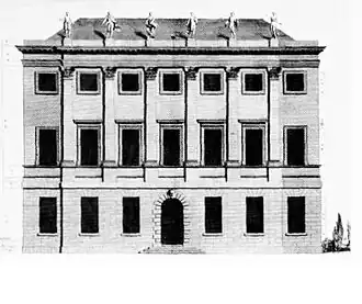 In a true Palladian house (one villa designed by Palladio himself), the central portion behind the portico would contain the principal rooms, while the lower flanking wings were domestic offices usually leading to terminating pavilions which would often be agricultural in use. It was this adaption of the wings and pavilions into the body of the house that was to be a hallmark of the 18th-century Palladianism that spread across Europe, and of which Leoni was an early exponent. At Lyme, while the central portico, resting upon a base reminiscent of Palladio's Villa Pisani, dominates the façade, the flanking wings are short, and of the same height as the central block, and the terminating pavilions are merely suggested by a slight projection in the facade. Thus in no way could the portico be seen as a corps de logis. This has led some architectural commentators to describe the south front as more Baroque than Palladian in style.[8] However, at this early stage of his career Leoni appears to have been still following the earlier and more renaissance-inspired Palladianism which had been imported to England in the 17th century by Inigo Jones. This is evident by his use of classical pilasters throughout the south façade, in the same way that Jones had used them, a century earlier, at the Banqueting House, Whitehall and Leoni's mentor, Alberti, had employed them at the Palazzo Rucellai in the 1440s. These features, coupled with the heavy mannerist use of rustication on the ground floor with segmented arches and windows, is the reason that Lyme appears more "Italian" than many other English houses in the Palladian style and has led to it being described as "the boldest Palladian building in England."[9]