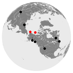 The giant pika has been found in North America from the Irvingtonian (1.8–0.3 Ma, Lower–Middle Pleistocene)[1][6][11] throughout Middle Pleistocene[6][10] to Late Pleistocene (0.1–0.0Ma)[3][5] locations.[2]
