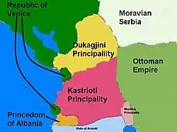 In 1463, Barbaro was appointed Provveditore of Albania.[33][9] While there, Barbaro he fought with Lekë Dukagjini and Skanderbeg against the Turks.[69][70][71][72][73] His instructions were to immediately contact Skanderbeg to discuss strategy against the Ottomans and convince Lekë Dukagjini to join the Venetian-Albanian alliance.[74][70][75][72][73] Barbaro was among Skanderbeg's councilors due to his judgment and experience.[76] Barbaro made a comprehensive inspection of the territory, meeting with the leading nobles and trying to recruit them.[77][9]