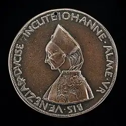The only known surviving portrait of a 15th-century dogaressa is that of Giovanna Dandolo on the reverse of a medal designed by Pietro da Fano (c. 1460).[4] She was the only dogaressa depicted on a portrait medal prior to the 16th-century, as well as one of only three Italian women, with Isotta degli Atti and Gianfrancesco I Gonzaga's daughter Cecilia Gonzaga, to have portrait medals made of them prior to this period.[1]