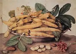 Plate with White Beans was one of the several works of art commissioned by the Medici family. The still life, painted sometime between 1650 and 1662, is a naturalistic study of beans in various stages of ripeness and decay. It is collection of the Galleria Palatina in Florence.[21]