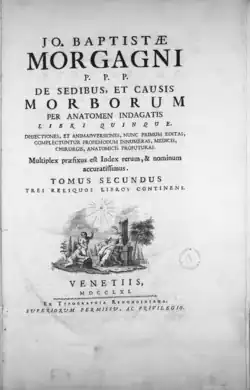 4. ^ Giambattista Morgagni (1761), De sedibus, et causis morborum per anatomen indagatis libri quinque, Venice: Typographia Remondini, OCLC 14313521, OL 24732940M