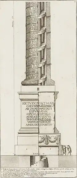 By the late 1660s Bellori assisted Leonardo Agostini in his duties as papal Commissario delle Antichità (contributing much of the commentary to Agostini's gem collection[17]), and in 1670 he took up the post himself, holding it for the next 24 years while undertaking an astonishing programme of further publications. These were at first sponsored by Cardinal Massimo, one on the Severan Marble Plan (1673), perhaps illustrated by himself, and one on Massimo's coin collection (1676). After Massimo's death in 1677, Bellori went on to catalogue rare coins in Cardinal Gaspare Carpegna's library, and then those belonging to Queen Christina of Sweden, for whom he also served as antiquario. In collaboration with the printer Giovanni Giacomo de Rossi and the painter-engraver Pietro Santi Bartoli (1635–1700), who had also worked for Massimo, he produced a hugely successful series of corpora, illustrated by Bartoli's engravings. An edition of prints of ancient bas-reliefs had already appeared by 1677, to be followed by the Column of Marcus Aurelius and its reliefs in 1679, the paintings in the Tomb of the Nasonii on the Via Flaminia, discovered in 1674 (published 1680), the triumphal arches of Rome in 1690, ancient funerary lamps in 1691-8 and ancient burials in 1697.[18]