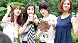 In August 2013, Girl's Day were appointed honorary ambassadors for the Plan Korea campaign "Because I Am a Girl".[25] That month the group visited Chiang Rai, Thailand, where they carried out volunteer work.[26][27] The group returned to Thailand a year later to participate in a campaign for girls' birth registration.[28] The entire proceeds from the group's concert in 2014 were donated to support the birth registration of girls in developing countries.[29] In February 2016, Sojin and Yura represented Girl's Day as Plan Korea ambassadors in Cambodia, volunteering at a school where they held art and music workshops.[25] Minah and Hyeri did not join the trip due to illness and drama commitments respectively. In 2017, Hyeri was appointed as one of the ambassadors for the Count Every Child birth registration campaign.[29][30]