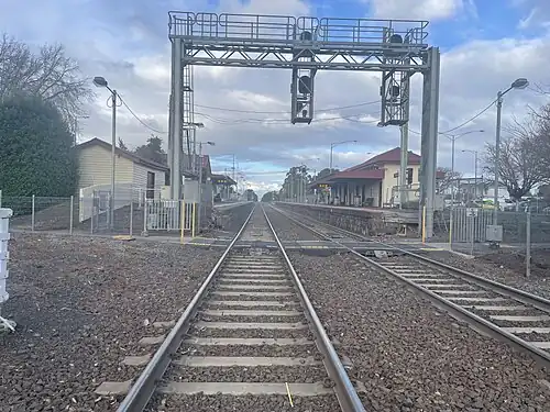Gisborne railway station is a regional railway station on the Bendigo Line, part of the Victorian railway network. It serves the north-western suburb and town of New Gisborne, in Victoria, Australia. Gisborne station is a ground level unstaffed station, featuring two side platforms. It opened on 8 July 1861.[2][3]
