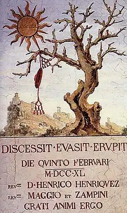Alberoni followed the order and left Spain for Italy. At Lleida, his belongings were searched to ensure that no state papers were in his possession. After leaving Barcelona, he was plundered by bandits. His baggage was again searched at Narbonne, by Customs officers under orders from the Chevalier de Marcieu, who had been ordered by the Regent of France to accompany Alberoni and extract whatever information he could from the Cardinal. Sailing for Italy, he was met at Sestri Levante in Genoese territory by a papal official, who forbade his entry into the Papal States, on penalty of imprisonment. When Alberoni retreated to Genoa, the Emperor and the Pope each tried to have him detained. On 19 March 1720, Clement XI appointed a Commission of Cardinals to try Alberoni: Albani, Astalli, Barberini, Bentivoglio, Conti, Corradini, Corsini, Fabroni, Paracciani, Paolucci, Scotti, Tanara, Tolomei, Vallemani, and Zondadari; they were joined by three other prelates: Alamanni, Marefoschi and Riviera. He escaped from arrest at Genoa, as the Genoese allowed him to go on his way, and found refuge at Castelnuovo Scrivia, in Austrian territory in Lombardy.[12] On the death of Clement in 1721, Alberoni boldly appeared at the conclave, and took part in the election of Innocent XIII (The cardinals voted to allow Alberoni to participate, but many of them refused to have anything to do with him personally), after which he was for a short time imprisoned in a monastery by the new pontiff on the demand of Spain on charges including sodomy (Elizabeth Charlotte of the Palatine noted in her diaries that he was a pederast).[13][14] He was ultimately cleared by a commission of his fellow Cardinals. At the conclave that would elect Pope Benedict XIII (1724), Alberoni had been himself proposed for the papal chair and secured ten votes.[6] Alberoni received the titular church Sant'Adriano al Foro (a cardinal-deaconry) in 1724, and then was made Cardinal Priest of San Crisogono in 1728.