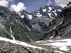 The two ice streams of the Glacier Noir merge at a height of over 2,400 m. However, the southern arm is about to retreat over the boundary between the lower basin and upper bowl, which will separate the glacier into distinct lower and upper sections.[3][5] Currently the combined tongue of ice flows from its junction, descending another good 200 metres in height, and ends beneath the northern foothills of Mont Pelvoux. It is about 400 metres wide at this point and a high and steep lateral moraine towers over it on the left-hand (northern) side, across which a climbing path runs from the Pré de Madame Carle, above the village of Ailefroide.