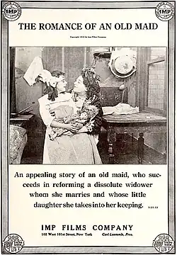 Egan appeared in a small number of productions for several studios other than Biograph. Between 1911 and 1914, she was cast by the Reliance Film Company–also headquartered in Manhattan–in The Empty Crib (1911), His Love of Children (1912), Votes for Women (1912), and Dream House (1913).[27] In the latter film, once again credited as "Gladys Eagan", she was among a cast described as a "Clever Company of Well Known Stage Children", a group that included Runa Hodges, who was billed as "The Prettiest Baby in the World".[28] The Independent Moving Pictures Company of America, more commonly referred to by the acronym "IMP", also cast Egan in four of it releases in 1912: The Romance of an Old Maid; Mrs. Matthews, Dressmaker; All for Her; and The Heart of a Gypsy.[29][30] Two other film studios that contracted Egan for roles were the Solax Film Company and the Photo Drama Company (PDC). For Solax she performed in the Western Two Little Rangers (1912) under the direction of Alice Guy-Blaché. The next year, at PDC, she portrayed the character Mary Morgan in Ten Nights in a Barroom, a drama directed by Lee Beggs and based on an 1854 temperance novel by Timothy Shay Arthur.[31]