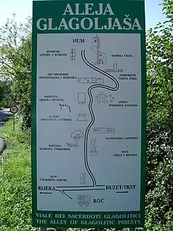 Glagolitic Alley (Croatian: Aleja glagoljaša) is a memorial composed of a string of eleven outdoor monuments dotting the road between the villages Roč and Hum in Croatia.[1] Sculptures were erected between 1977 and 1985 to honor the historical Croatian scribal tradition in Glagolitic script.[2] The road is seven kilometers (4.3 mi) long and located in the region of Istria.