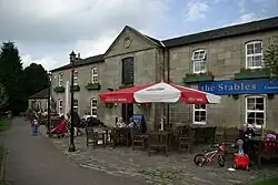 The 'Stables' bar and restaurant was developed from the stables which supported the horses which serviced the canal work.[6] The road sign outside informs drivers of the location of Craft daft (on a raft). Note this has now moved to Southbank Marina in Kirkintilloch.