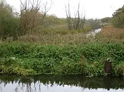 Following the course of the enlarged South Drain, a lock raised the level of the canal at Shapwick, while the Drain turned off to run parallel to the canal but to its north. The railway ran between the two waterways, crossing to the south side of the canal immediately after the single arched aqueduct and syphon over the South Drain. The remains of the three-arched aqueduct and syphon over the River Brue are still visible, near the old railway bridge, and from there the canal headed towards Glastonbury, passing the Ham Wall and Street Heath nature reserves and making a sharp right-hand turn just before its terminal basin, which was located near the old Glastonbury and Street railway station.[35]