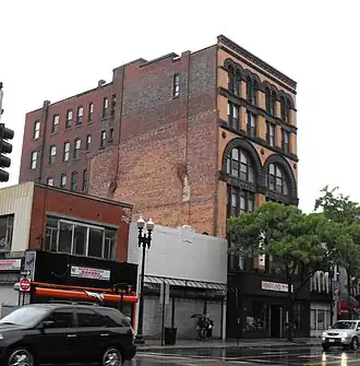 It is a Richardsonian Romanesque style building, six stories (72 feet) tall, faced in brick and brownstone. It was built by William Oswald to a design by Arthur F. Gray, and boasted the city's first hydraulic elevator. The second to fourth floors of the facade are divided in two sections by brick piers that rise to round brownstone arches, with bands of sash windows on the lower two levels. The top floor is also architecturally distinctive, with four pairs of windows, each topped by a round brownstone arch.[2]