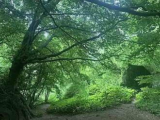 The tree canopy is made up of broadleaf trees such as oak, cherry, rowan and ash.[4] Beneath this canopy grows bilberry, bramble, wild garlic, holly, honeysuckle, ivy, woodrush and wood sage.[6]