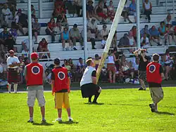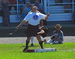 The caber toss event involves tossing a 22-foot-long spruce log weighing about 125 lbs. The stone thrower event involves hurling a 25-lb. rock shot-put style. The 28-lb. and 56-lb. weight throw events involves using a one-handed throw to heave an iron block with iron ring attached. For the 16-lb. hammer throw, competitors propel a round metal ball with a wooden handle. The 56-lb. weight toss event involves competitors launching the weight over a pole vault.[3]