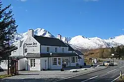 The Cluanie Inn at the head of Glen Shiel, with the A87 (right) and the South Glen Shiel ridge (background)
