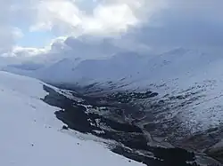 To the south of the glen, the South Glen Shiel (or South Cluanie) ridge (Creag a' Mhàim, Druim Shionnach, Aonach air Chrith, Maol Chinn-dearg, Sgùrr an Doire Leathain, Sgùrr an Lochain and Creag nan Damh) occupies the upper part, and in the lower part are The Saddle, according to W. H. Murray "the best mountain of the region both in distant shape and close acquaintance,"[7] and Sgùrr na Sgine.[8] From Glen Shiel these last two mountains are only accessible by the side glens – Allt Mhalagain is the most popular – that run off Glen Shiel, unlike the North and South Glen Shiel ridges whose slopes can be reached directly as they run along the glen.