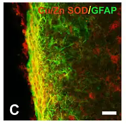 Copper/Zinc Superoxide Dismutase (Cu/Zn SOD), shown in orange, is an important factor in the brain's immune response. Here it is seen in close association with the glial fibrillary acidic protein (GFAP), an indicator of the presence of astrocytes, at the surface of the glial limitans