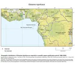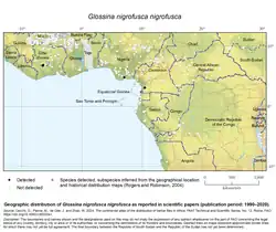 Glossina nigrofusca was historically reported in a narrow and fragmented belt in West Africa and Central Africa, from Sierra Leone in the West to Uganda in the East.[2] However, a review of the scientific literature from 1990–2020 found confirmation of G. nigrofusca in only three countries;[1] Côte d’Ivoire,[3][4] Cameroon and Nigeria.[5] In Cameroon, all published reports of G. nigrofusca for the period 1990–2020 originate from the sleeping sickness foci of Campo and Bipindi.[1][6][7] The two subspecies of G. nigrofusca are generally believed to be geographically separated.[1][8][9]
