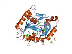 In molecular biology, glutamine amidotransferases (GATase) are enzymes which catalyse the removal of the ammonia group from a glutamine molecule and its subsequent transfer to a specific substrate, thus creating a new carbon-nitrogen group on the substrate. This activity is found in a range of biosynthetic enzymes, including glutamine amidotransferase, anthranilate synthase component II, p-aminobenzoate, and glutamine-dependent carbamoyl-transferase (CPSase). Glutamine amidotransferase (GATase) domains can occur either as single polypeptides, as in glutamine amidotransferases, or as domains in a much larger multifunctional synthase protein, such as CPSase. On the basis of sequence similarities two classes of GATase domains have been identified: class-I (also known as trpG-type) and class-II (also known as purF-type).[1][2] Class-I GATase domains are defined by a conserved catalytic triad consisting of cysteine, histidine and glutamate. Class-I GATase domains have been found in the following enzymes: the second component of anthranilate synthase and 4-amino-4-deoxychorismate (ADC) synthase; CTP synthase; GMP synthase; glutamine-dependent carbamoyl-phosphate synthase; phosphoribosylformylglycinamidine synthase II; and the histidine amidotransferase hisH.