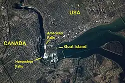 The island was formed during the recent retreat of the falls as it cut inward (upstream) through the Niagara Escarpment. The Niagara River's channel splits in two above the falls, creating two sets of falls, one on either side of the island.[2] In 1959–60, the island's eastern side was extended about 8.5 acres (34,000 m2) for additional parking and a helicopter pad.[3] Fill was provided from excavation for the construction of the Robert Moses State Parkway. In 1954–1955 the area between the Terrapin Rocks and Goat Island was filled in, creating Terrapin Point.[4]