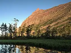 Like other mountains in Glacier National Park, it is composed of sedimentary rock laid down during the Precambrian to Jurassic periods. Formed in shallow seas, this sedimentary rock was initially uplifted beginning 170 million years ago when the Lewis Overthrust fault pushed an enormous slab of precambrian rocks 3 mi (4.8 km) thick, 50 miles (80 km) wide and 160 miles (260 km) long over younger rock of the cretaceous period.[6]