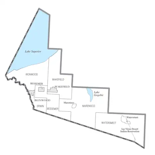 Gogebic County (/ɡoʊˈɡiːbɪk/ goh-GHEE-bik or /ɡoʊˈɡɛbɪk/ goh-GHEH-bik) is a county in the Upper Peninsula of the U.S. state of Michigan. As of the 2020 census, the population was 14,380.[2] The county seat is Bessemer.[3] Gogebic County is the westernmost county in Michigan, and is one of four Michigan counties within the Central Time Zone. Gogebic County borders Wisconsin to the south, and has a shoreline on Lake Superior to the north.