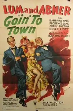 Goin' to Town is a 1944 American comedy film directed by Leslie Goodwins from an original screenplay by Charles E. Roberts and Charles R. Marion, based upon the successful radio program Lum and Abner created by Chester Lauck and Norris Goff. It was the fifth of seven films in the Lum and Abner series, and was released by RKO Radio Pictures on September 28, 1944. The film stars Lauck and Goff, along with Florence Lake and Andrew Tombes.