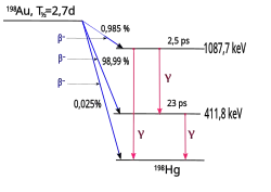 Gold-198 (198Au) is a radioactive isotope of gold. It undergoes beta decay to stable 198Hg with a half-life of 2.69464 days.