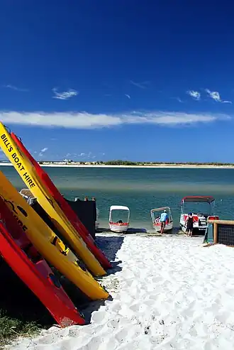 The long sandspit at the northern tip of Bribie Island protects Golden Beach from the Coral Sea.[4] However, this section of the Pumicestone Passage is very narrow and very shallow (less than 2 metres (6 ft 7 in)) with shifting sand and mud banks, which makes the northern sandspit highly dynamic in shape through natural processes of sand/mud buildup and erosion. During storms, waves may cross over the sandspit from the Coral Sea into the Pumicestone Passage, with the potential to break through the sandspit to create new entrances to Pumicestone Passage. The creation of new entrances would impact on Golden Beach and Pelican Waters, which would then be exposed more directly to the stronger wave action of the Coral Sea as opposed to the calmer waters of the Pumicestone Passage.[5] In December 2020, wild weather began creating channels from the ocean through the northern sandspit into Pumicestone Passage.[6]