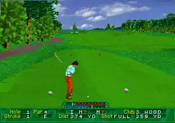 Players are given a variety of options for play, including selection of clubs, clothing their golfing character wears, and in which order the holes are played.[1] During play, golfers are viewed from behind.[2] Swinging a golf club in the game require three button presses:[1] players must select a shot type and a club, then position the shot. A button press initiates the swing on a power meter that rises and falls; pressing the button again swings at the level of power at which the meter is stopped.[3] During the setup for the swing, players can look at the map of the hole and adjust their stance to change the swing.[4]