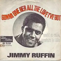 "Gonna Give Her All the Love I've Got" is a 1967 Soul song, originally recorded and made a hit by Jimmy Ruffin on Motown's Soul Label imprint.[1] Ruffin's 1967 original version, from his album Jimmy Ruffin Sings Top Ten, reached the Pop Top 30, peaking at #29, and was a Top 20 R&B Hit as well, peaking at #14.[2] It was also a hit in Britain, reaching #26 on the UK Singles Chart. The song has a social context: it depicts a man anticipating his release from prison on the morrow, when he'll return home on a train to "the girl that I left behind," promising himself that he will reward her steadfast love for him by "giv[ing] her all the love [he's] got." The song was written by Norman Whitfield and Barrett Strong and produced by Whitfield.