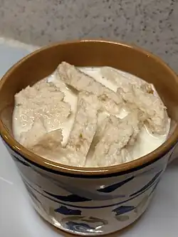 Goody or goodie is a sweet Irish dish made by boiling bread in milk with sugar and spices. It is often given to children or older adults who are convalescing.[1][2] This dish is eaten on St. John's Eve where it would be prepared near the bonfires lit to celebrate.[3] A variation was prepared using milky tea to soak the bread.[4] The dish is also prepared by parents to give to children when they have an upset stomach.[5]