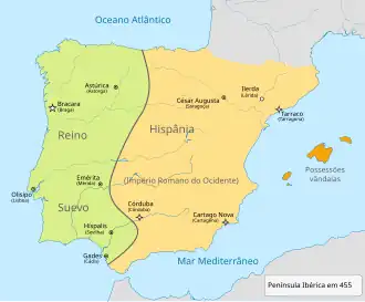 The Gothic War in Spain of 456 was a military operation of the Visigoths commissioned by the West Roman emperor Avitus.[2] This operation consisted of an extensive campaign aimed at reclaiming the Spanish provinces of Lusitania and Betica that were in the hands of the Suebi and threatened Roman power in the provinces of Cartaginensis and Tarraconensis. The main players in this war were Theoderic II who led the army of the Visigoths and Rechiar the king of the Suebi. The Visigothic army was supported by Franks and Burgundian auxiliary troops.