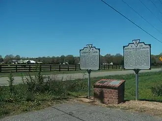 ![]() The historic marker for Governor's Land, with some of the farmland adjacent; the marker is the location at which the plaques for the Virginia Landmarks Register and National Register of Historic Places have been installed | |