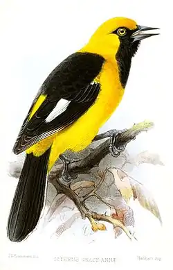Another women who influenced and inspired Lewis was her friend Mary Townsend, the sister of John Kirk Townsend.[4] Mary had written a book on insects and Lewis expressed a wish to emulate her.[4] During the 1850s Lewis moved to Philadelphia, where she worked closely with a small circle of Quakers who were active in the natural sciences.[2] These included Ezra Michener and Vincent Bernard.[6] She met one of America's leading ornithologists, John Cassin of the Philadelphia Academy of Natural Sciences, in 1862 and studied ornithology at an advanced level under his tutorship for the next half decade.[2] In 1867 Cassin honored his protege with the naming of Icterus graceannae, the White-edged Oriole in Lewis's honor.[7]