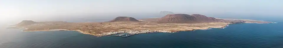 Graciosa Island or commonly La Graciosa (Spanish: [la ɣɾaˈsjosa] ⓘ; Spanish for "the graceful") is a volcanic island in the Canary Islands of Spain, located two kilometres (one nautical mile) north of Lanzarote across the Strait of El Río. As the rest of the Canary Islands, it was formed by the Canary hotspot. The island is part of the Chinijo Archipelago and the Chinijo Archipelago Natural Park (Parque Natural del Archipiélago Chinijo).[4][5] It is administered by the municipality of Teguise in the neighboring island of Lanzarote. In 2018 La Graciosa was officially declared the eighth Canary Island by the Spanish Senate,[6] with few real effects.[7] Before then, the island had the status of an islet. It is administratively dependent on the island of Lanzarote.