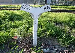 A railroad gradient sign in Gdańsk, Poland, indicating a 50 per mille (5%) slope.