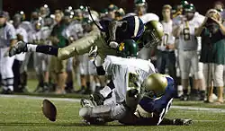 Two Granby defenders break up a pass from Great Bridge's quarterback at Granby's Powhatan Field.