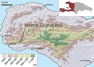 Grand Bois National Park (French: Parc National Naturel de Grand Bois, Haitian Creole: Gran Bwa Pak Nasyonal) is a national park in Haiti. It was established on September 23, 2015, by Haitian president, Michel Martelly.[1] The park is located in southwest Haiti, northwest of Les Anglais and it includes all areas on the mountain Morne Grand Bois of 900 meter elevation and higher. Morne Grand Bois sits directly on the border between the Sud department and the Grand'Anse department. Its highest peak is 1262 meters in elevation. Morne Grand Bois is an isolated mountain with remnant original (primary) rainforest.[2]